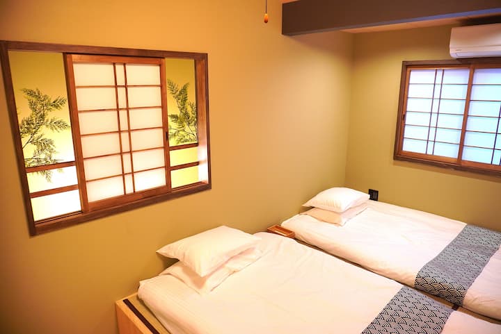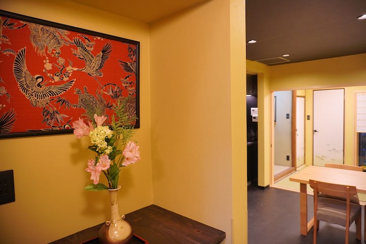 館内には、京舞扇や着物、竹簾などの美しい装飾が施されています。3つある寝室にはそれぞれ「桜・松・紅葉」のテーマが設けられ、訪れるたびに異なる風情を感じられるのが魅力です。最大10名様(大人8名+8歳以下児童2名)まで宿泊可能なため、ご家族やグループ旅行でもゆったりとお過ごしいただけます。
